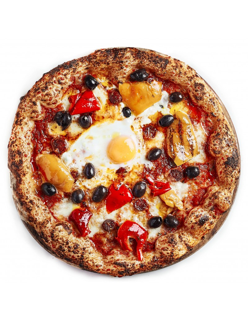 Sauce tomate, mozza, merguez du boucher, poivrons, oeuf et olives