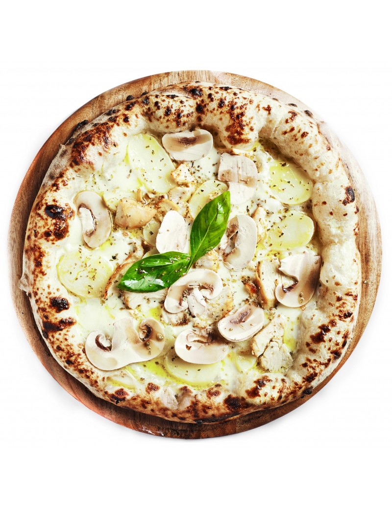 Crème fraîche, mozza, émincés de poulet mariné, pomme de terre, champignon frais et persillade