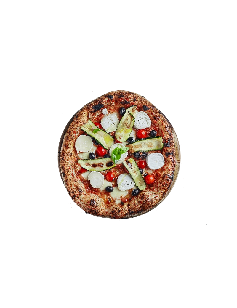 Sauce tomate, mozza, olives noires, chèvre, courgettes grillées, tomates cerises