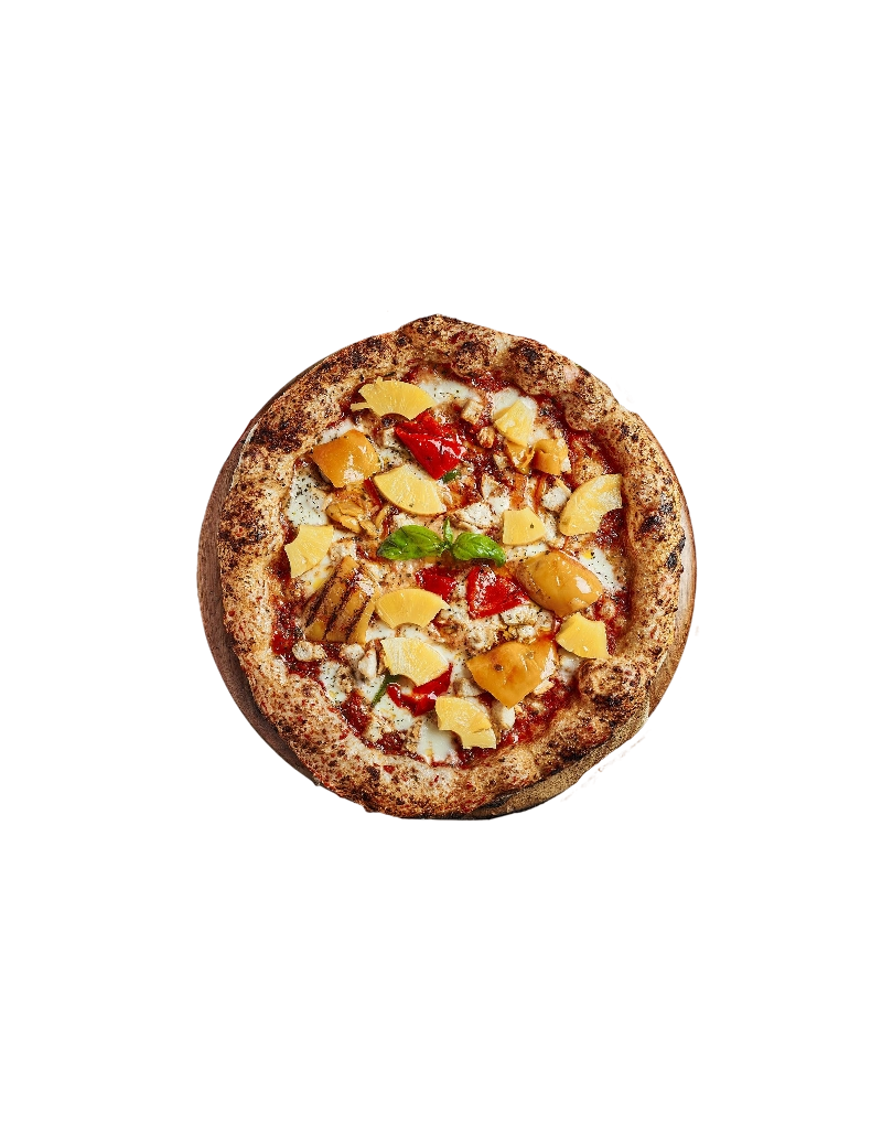 Sauce tomate, mozza, émincés de poulet mariné, ananas, poivrons, basilic frais