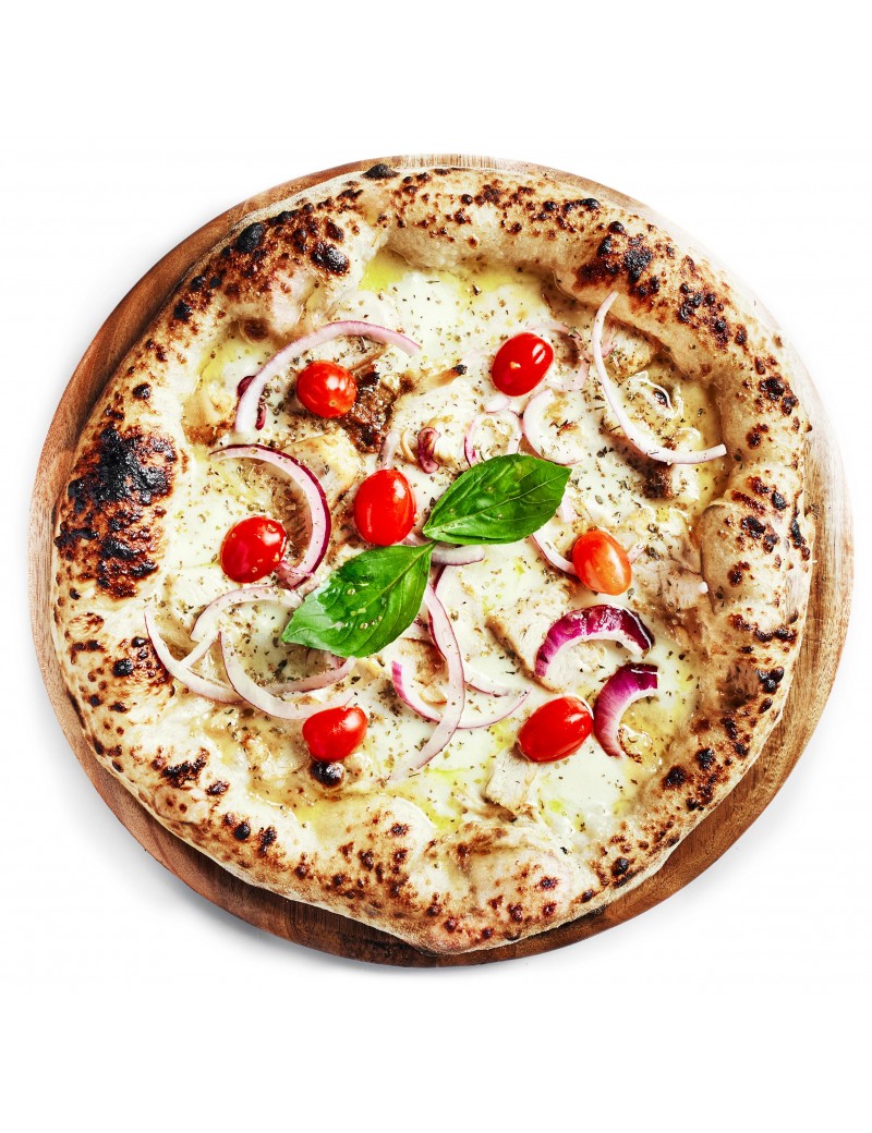 Base moutarde au miel, mozzarella, émincés de poulet mariné, comté, beaufort et oignons rouges