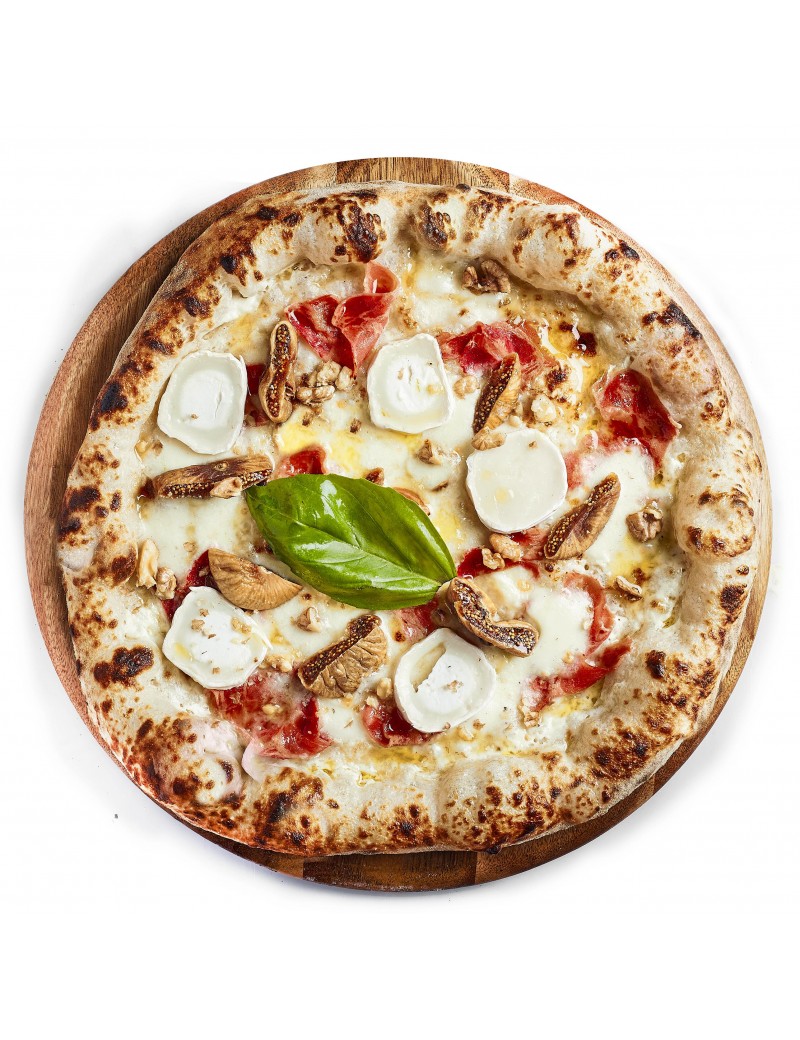 Crème fraîche, mozzarella, jambon de dinde, fromage de chèvre, miel, figues séchées et noix